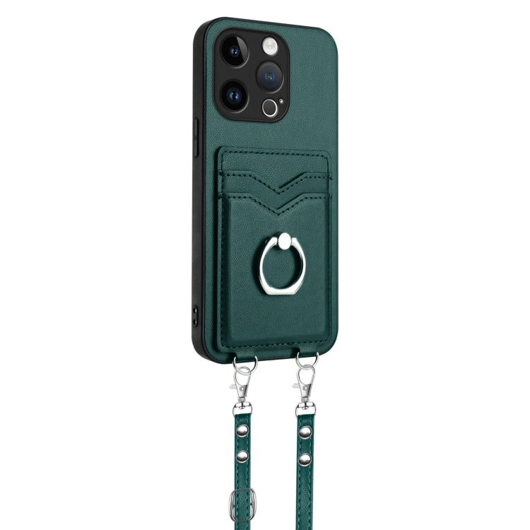 Funda para Teléfono iPhone 15 Pro R20 con Soporte para Tarjeta y Anillo de Cuerda Cruzada (Verde)