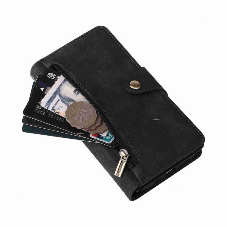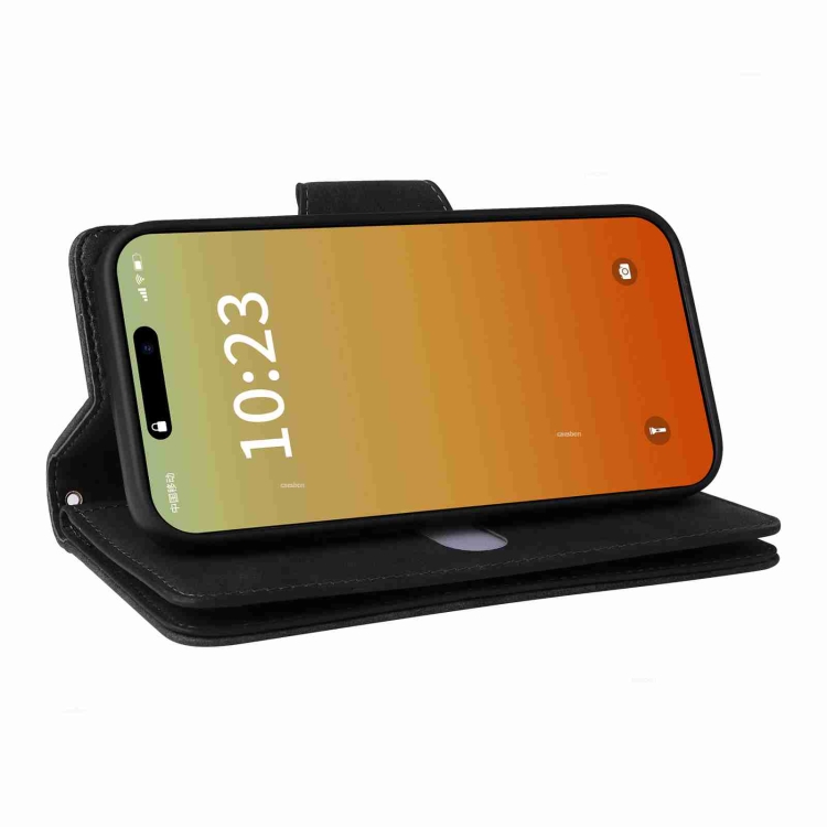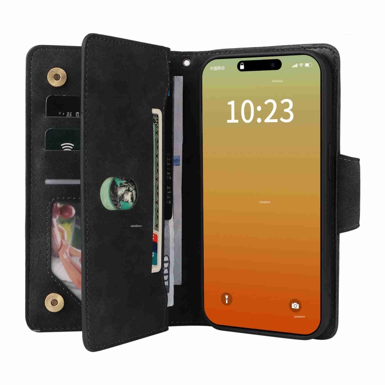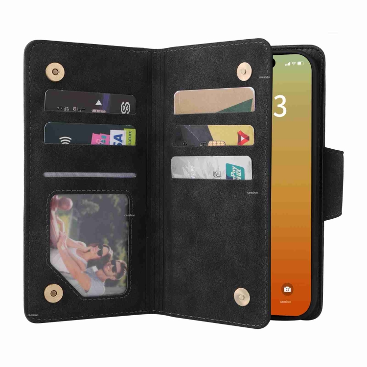 Funda de Cuero para iPhone 15 Pro con Hebilla Remache y Tres Pliegues para 9 Tarjetas (Negro)