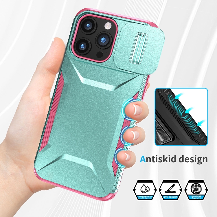 Funda para iPhone 15 Pro Sliding Camshield Phone Case (Gris Verde + Rosa)