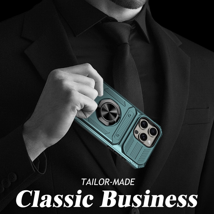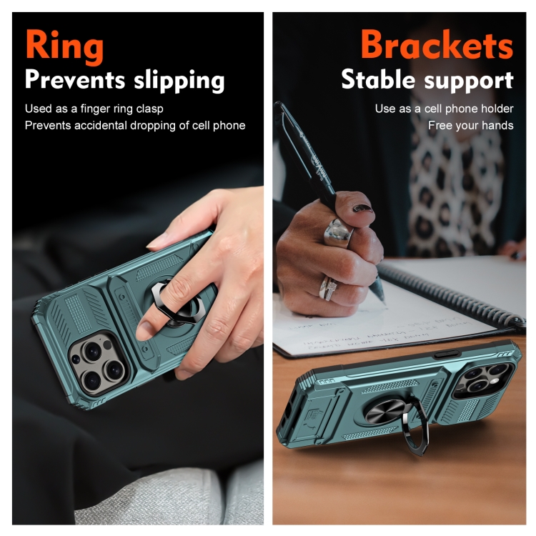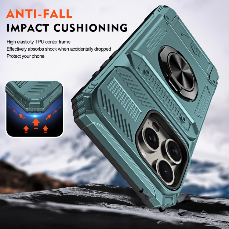For iPhone 15 Pro TPU+PC Shockproof Card Holder Phone Case with Metal Ring Holder (Green)