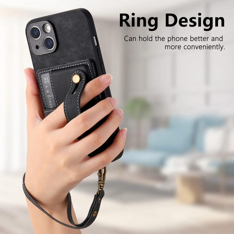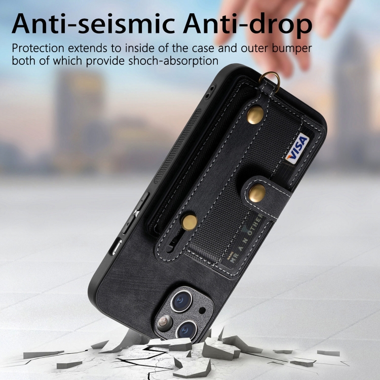 Funda Trasera para iPhone 15 Retro Cross Muñequera Monedero de Cuero (Negro)