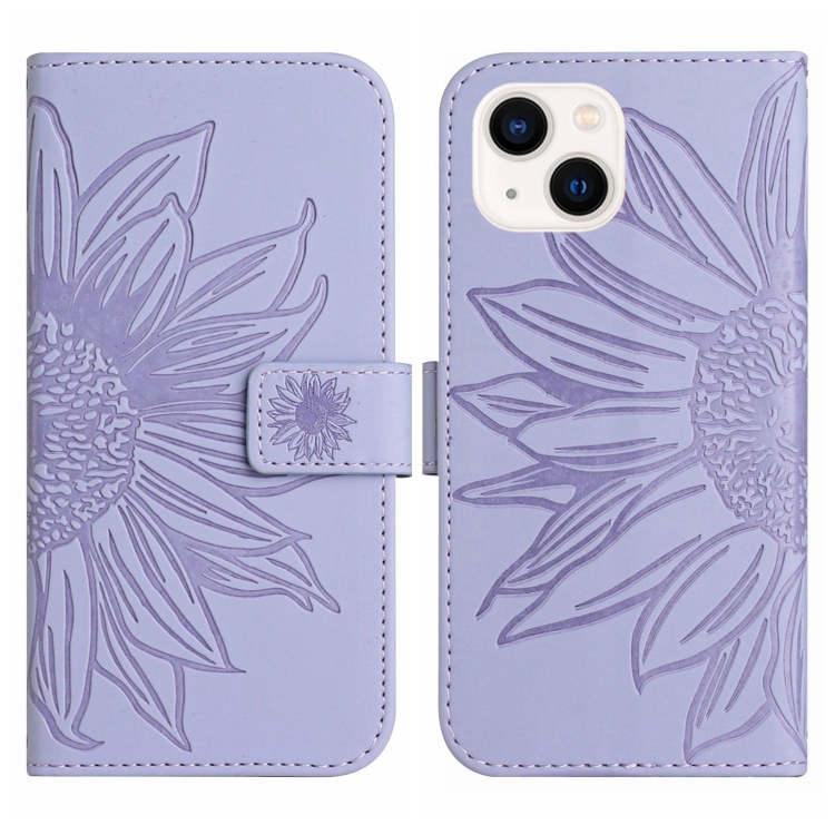 For iPhone 15 Skin Feel Sun Flower Embossed Flip Leather Case with Lanyard(Purple)