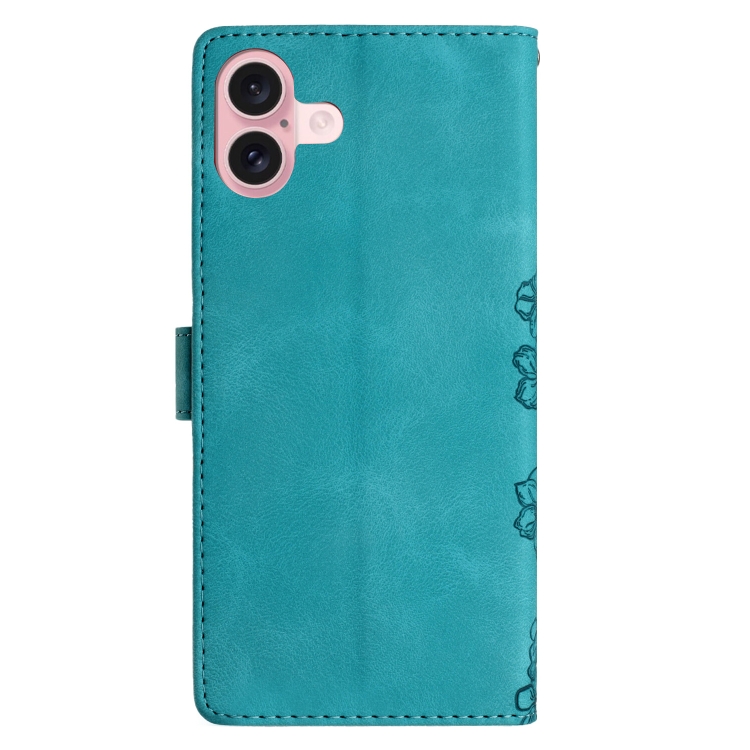 Funda para Teléfono iPhone 16 Pu con Sensación de Piel Mariposa y Flor de Cerezo En Relieve (Verde)