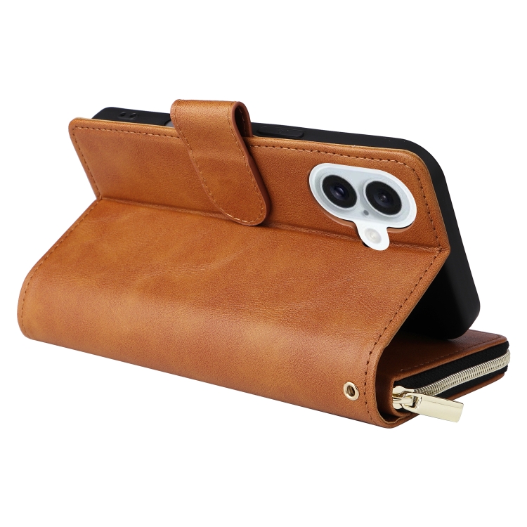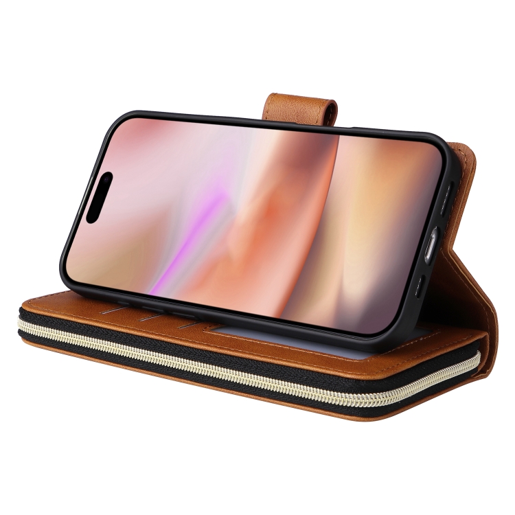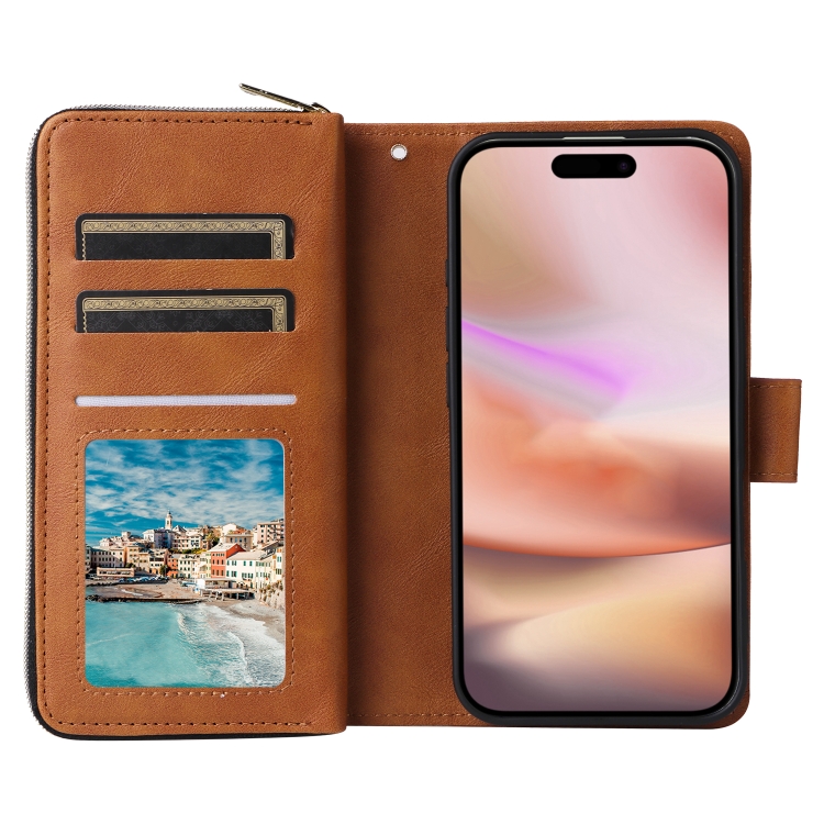 Funda para iPhone 16 Plus Bolso Tipo Billetera con 9 Ranuras para Tarjetas y Cremallera (Marrón)