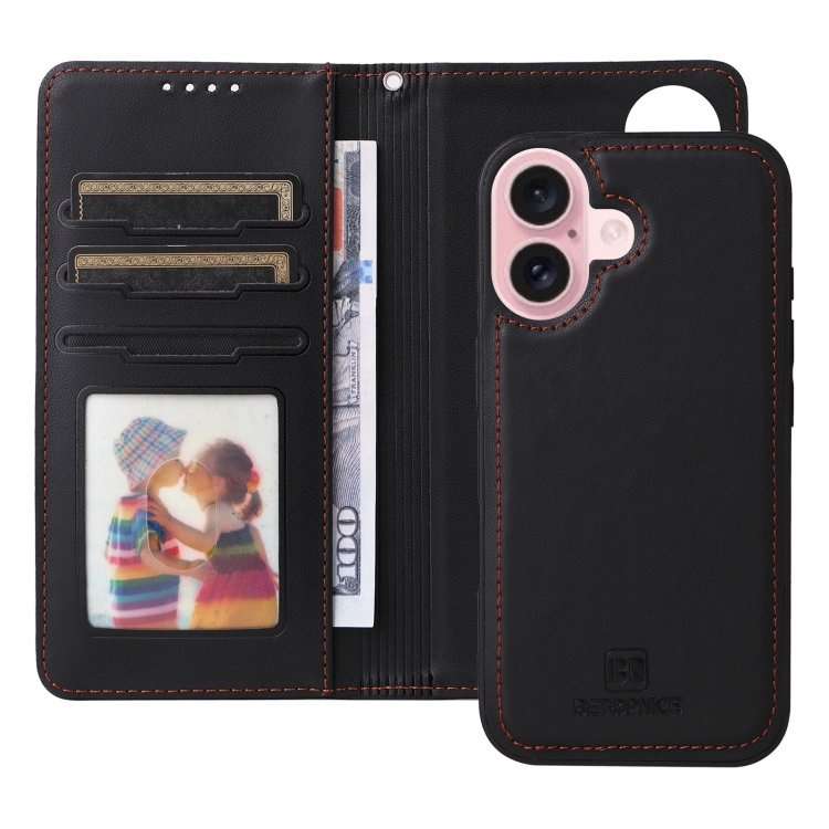 Funda de teléfono Betopnice Bn-005 para iPhone 16 Plus 2 en 1 desmontable imitación cuero genuino (Negro)