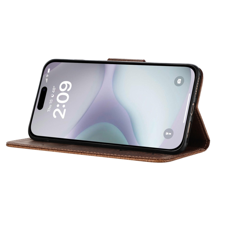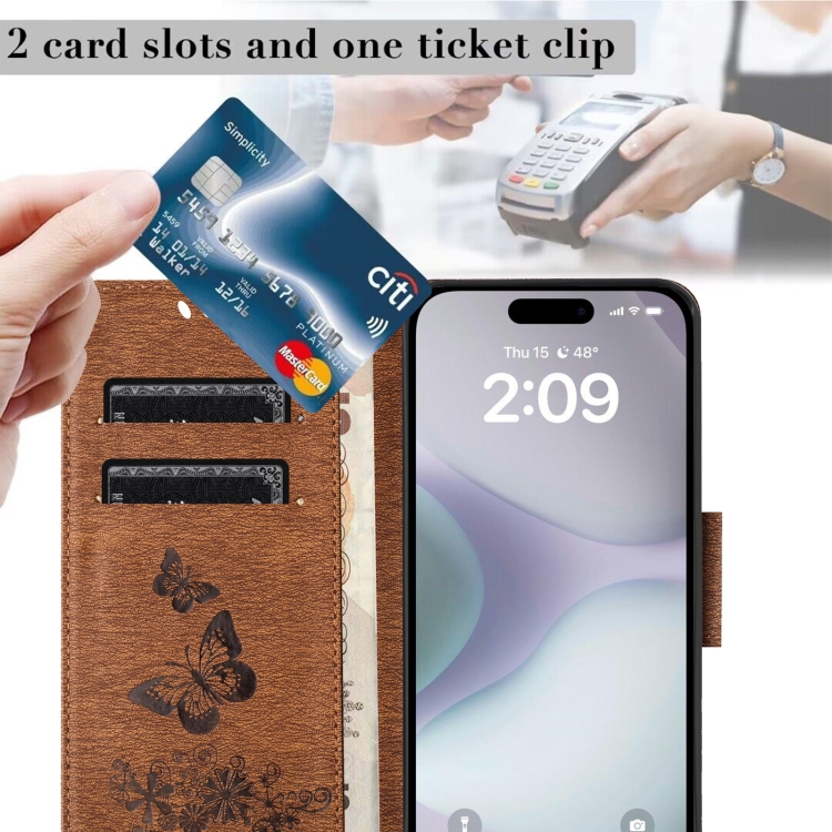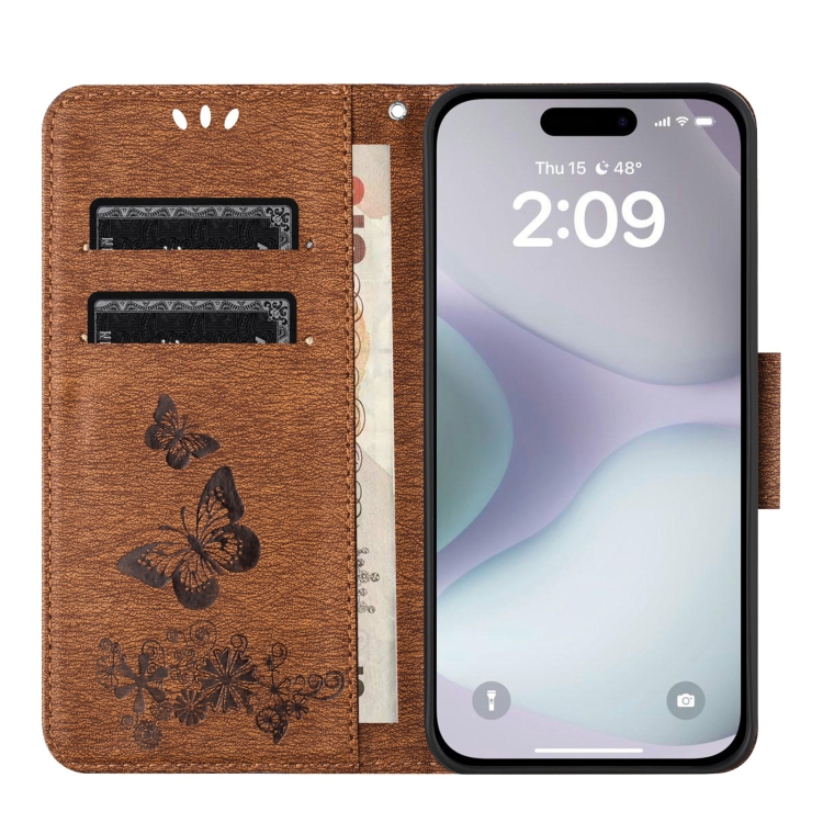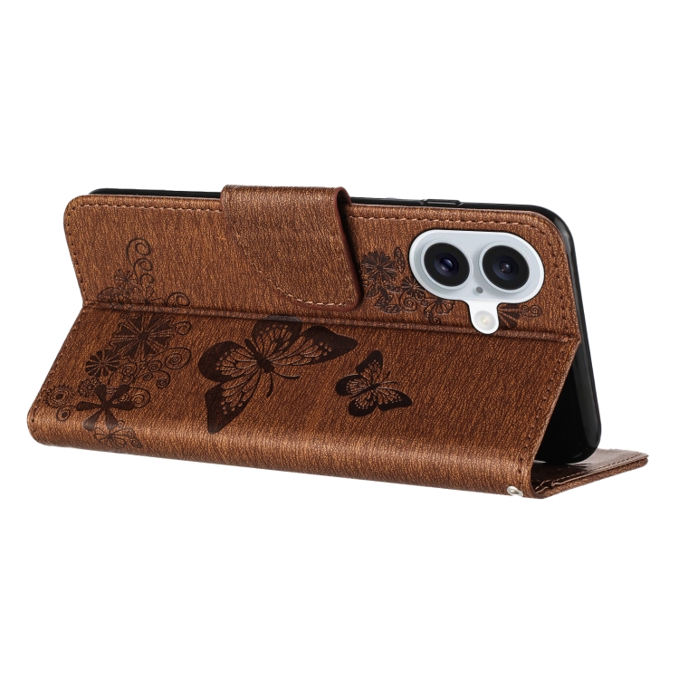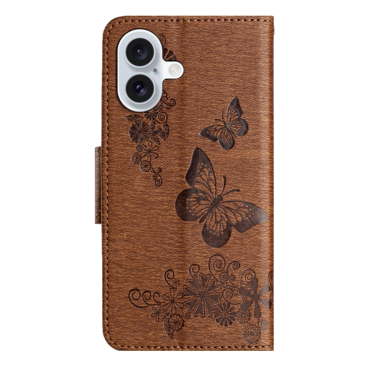 Funda para iPhone 16 Plus Cuero con Tapa y Relieve de Mariposa (Marrón)
