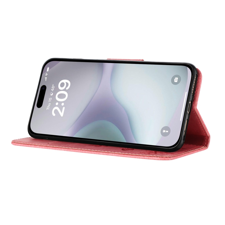 Funda de Cuero para iPhone 16 Plus con Tapa y Relieve de Mariposa (Rosa)