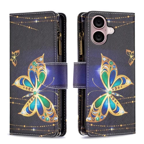 Funda para iPhone 16 Plus Cuero con Cremallera y Patrón Mariposa Grande