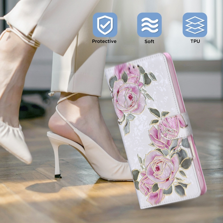 Funda de Cuero RFID para iPhone 16 Plus con Pintura Bronceadora (Flor Rosa)