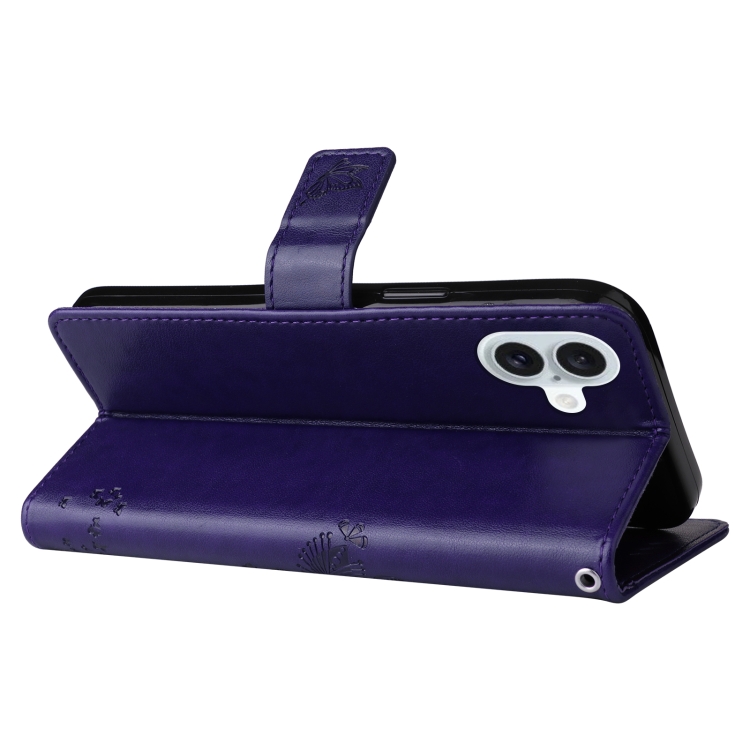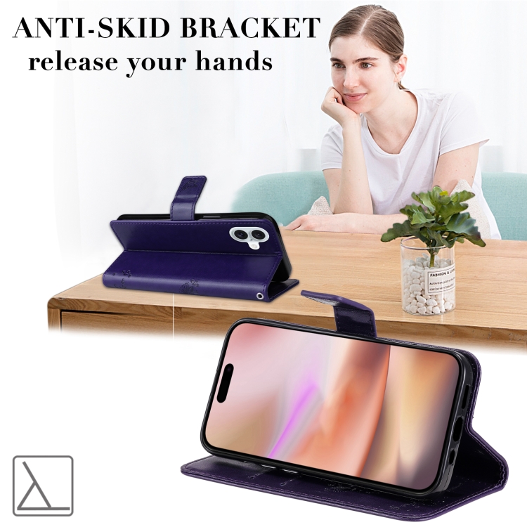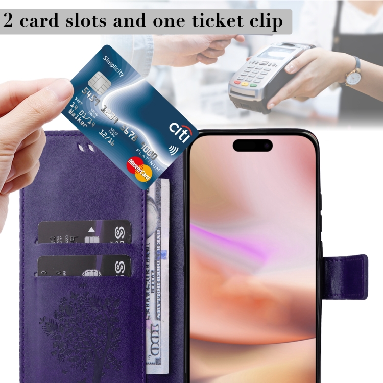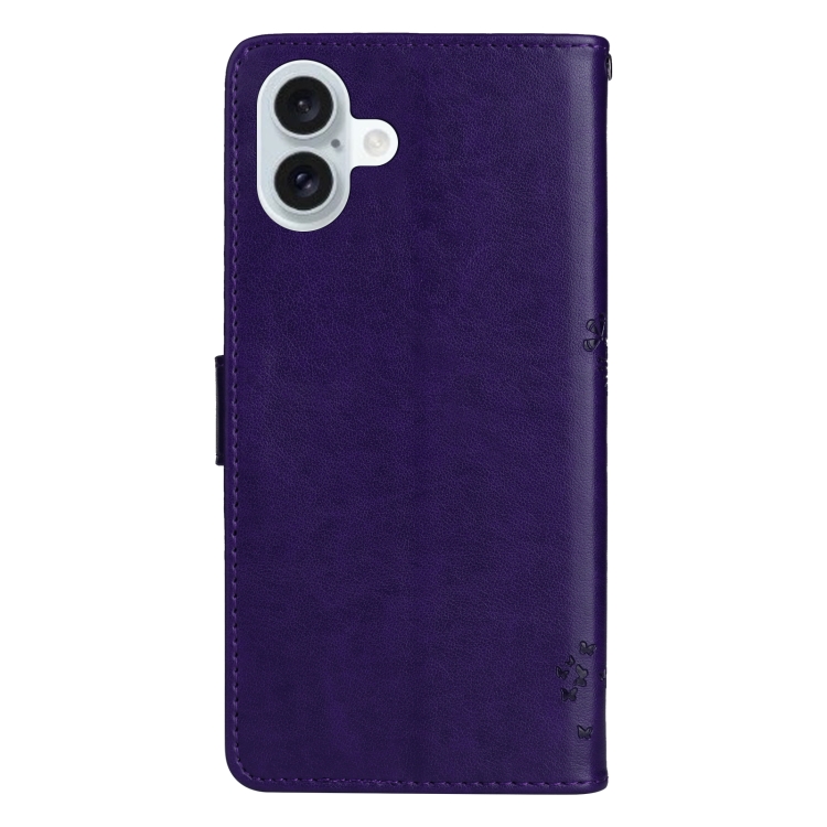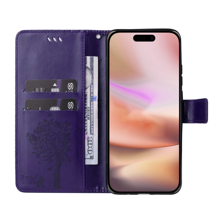 Funda para Teléfono iPhone 16 Plus Cuero con Tapa Patrón En Relieve Árbol y Gato (Púrpura)