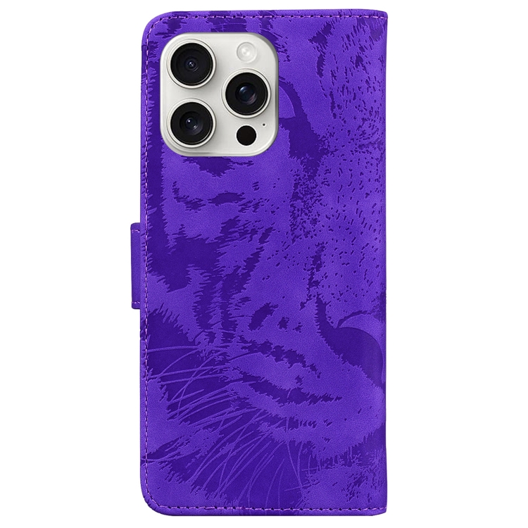 Funda para Teléfono iPhone 16 Pro Cuero con Patrón de Relieve de Tigre (Púrpura)