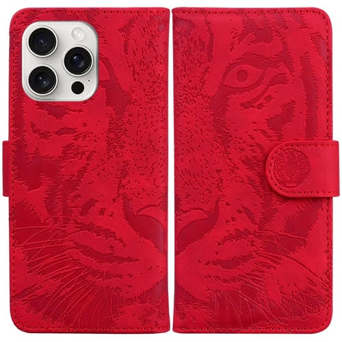 Estuche de Cuero para Teléfono iPhone 16 Pro Max con Patrón de Relieve de Tigre (Rojo)