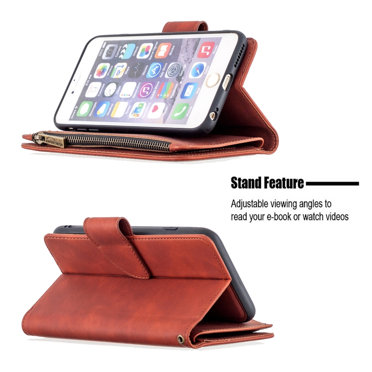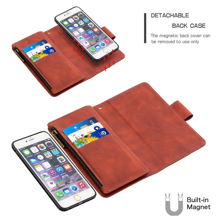 Estuche para iPhone 6 Plus Skin Feel Cuero PU con Cremallera Magnética Desmontable Tapa Horizontal Ranuras Tarjetas Soporte Billetera Marco Fotos Cordón (Marrón)