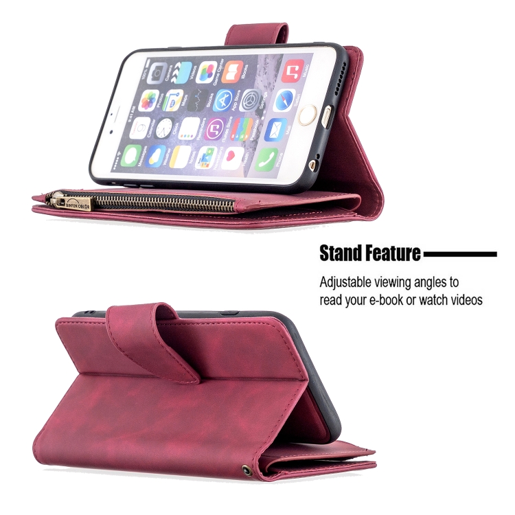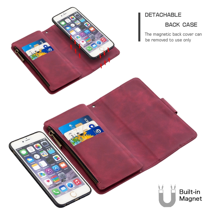 Estuche para iPhone 6 Plus Skin Feel Cuero Pu Cremallera Magnética Tapa Horizontal Ranuras Tarjetas Soporte Billetera Marco Fotos Cordón (Rojo)