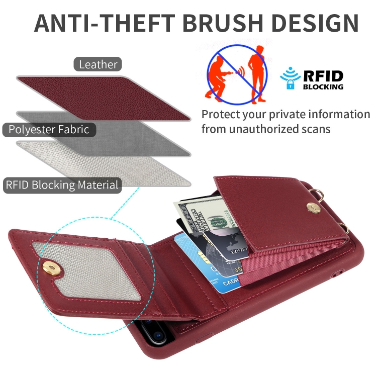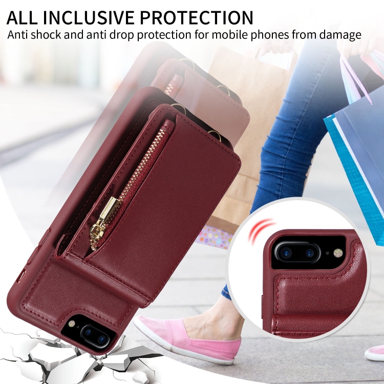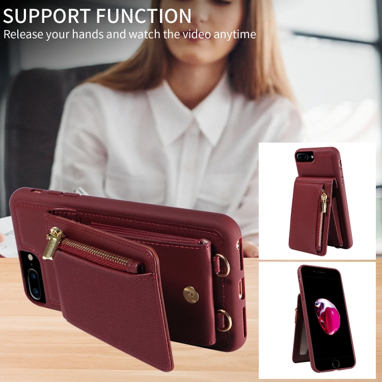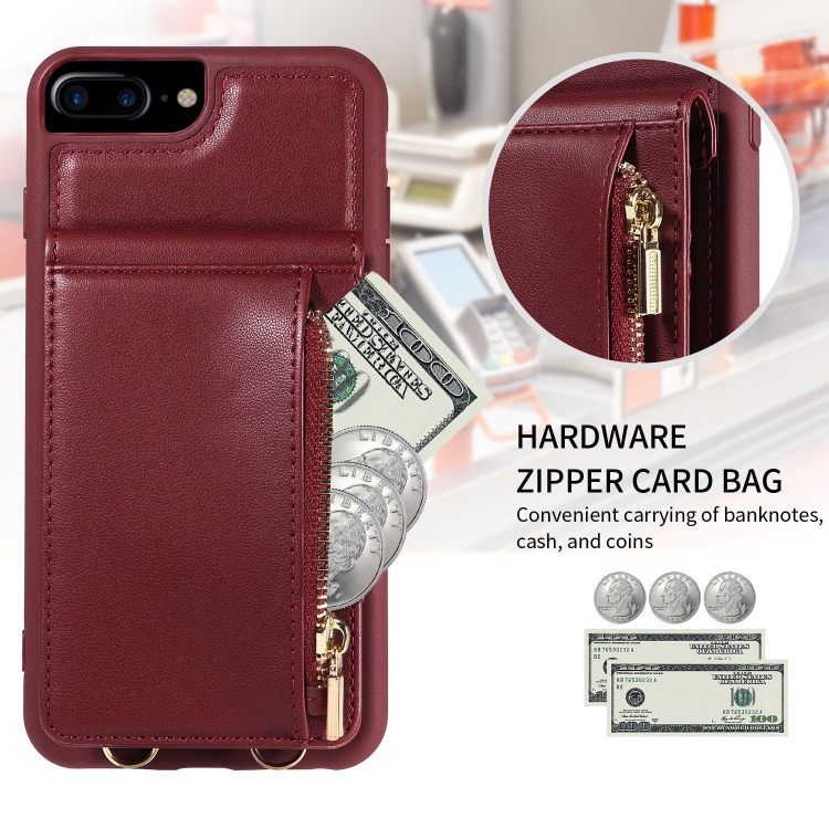 Funda de Cuero Crossbody Lanyard Zipper para iPhone 7 Plus 8 Plus (Rojo Vino)