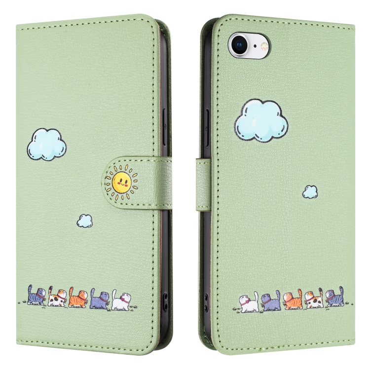 Funda de Cuero para iPhone SE 2022 y SE 2020 con Gatos de Dibujos Animados (Verde)