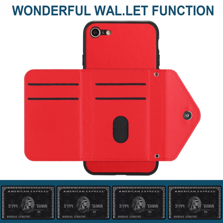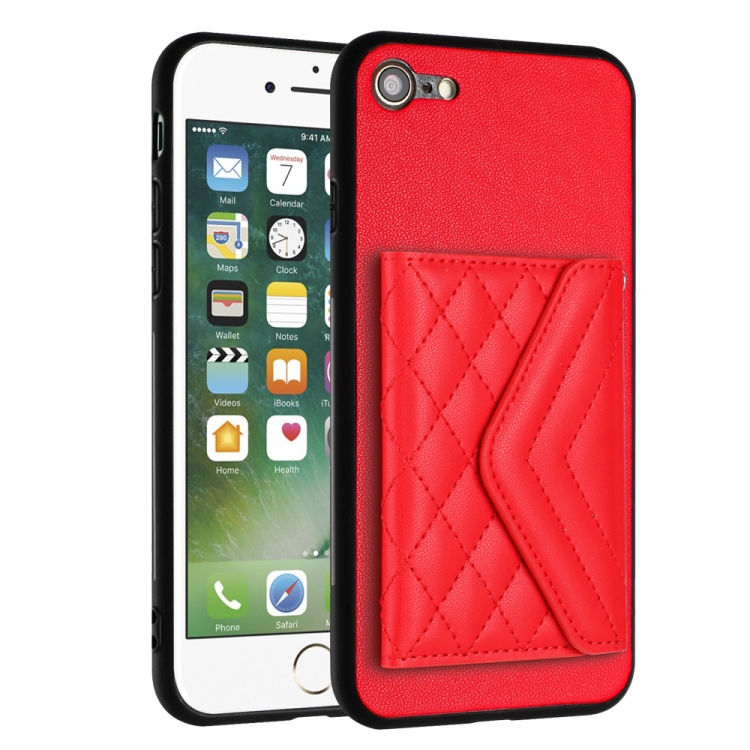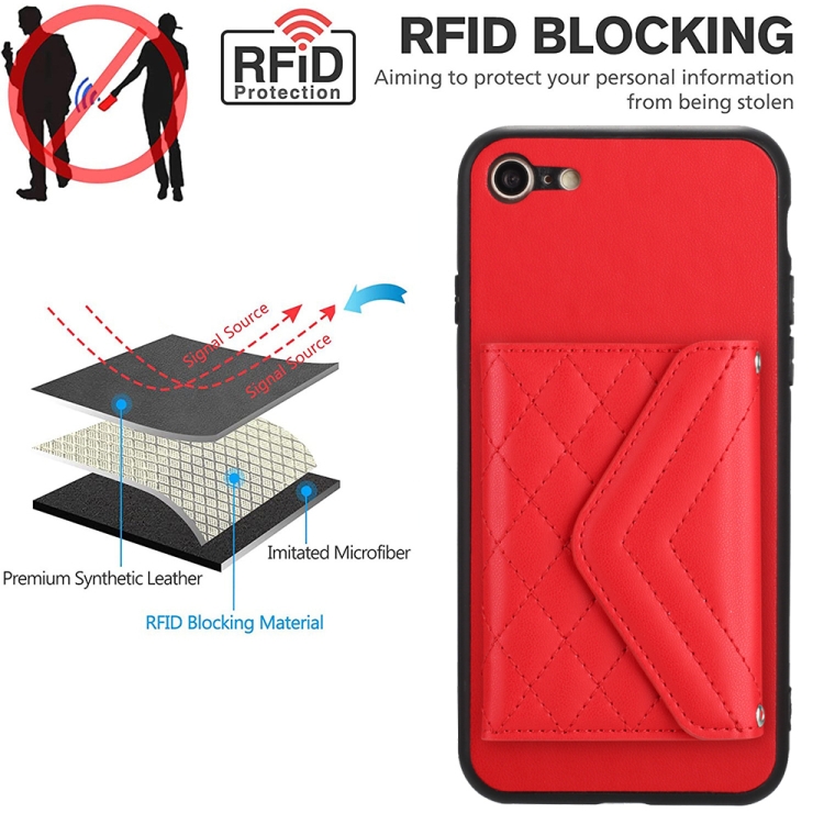 Funda para teléfono iPhone SE 2022/SE 2020 con RFID, bolsa para tarjetas, textura rómbica y cordón largo (Rojo)