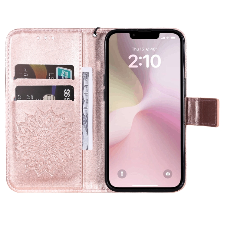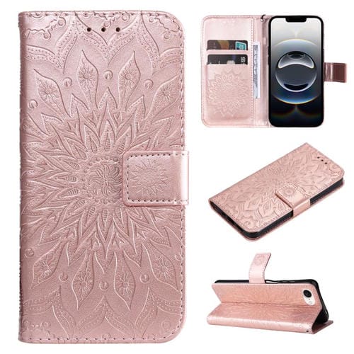 Funda de Cuero con Tapa y Estampado de Girasoles En Relieve para iPhone 16E (Oro Rosa)