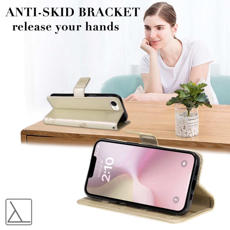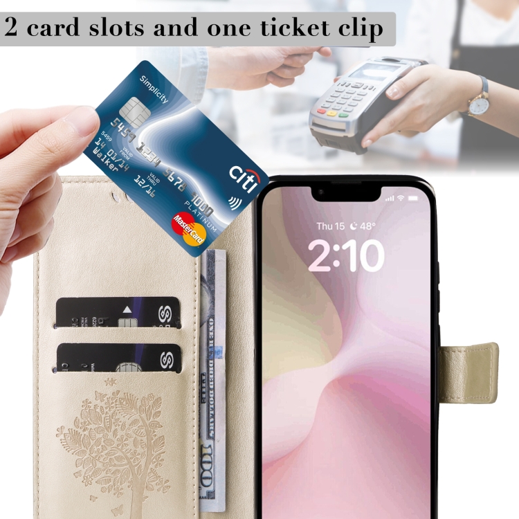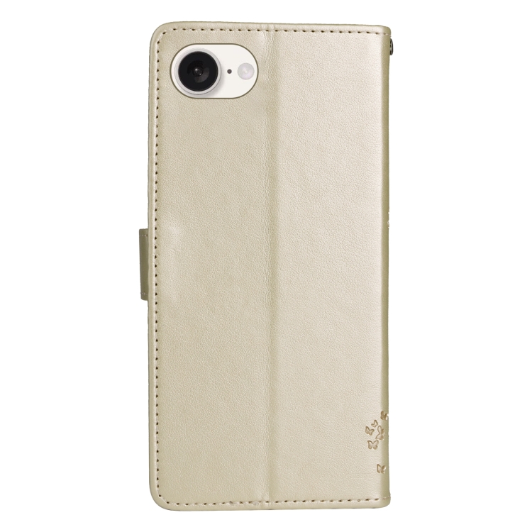 Funda de Cuero con Tapa con Diseño de Árbol y Gato En Relieve para iPhone 16E (Dorada)