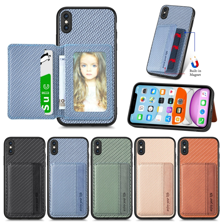 Caja de teléfono para iPhone X Xs con bolsa de tarjeta magnética de fibra de carbono (Marrón)