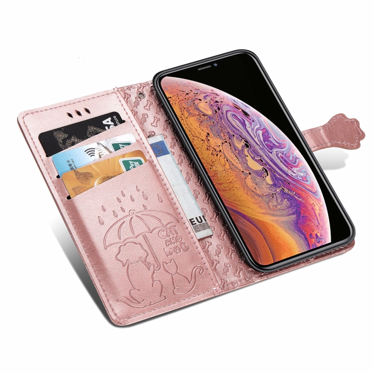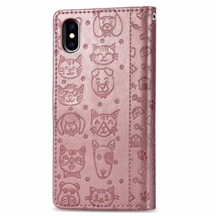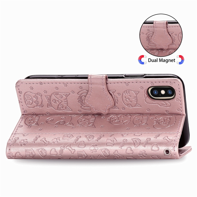 Estuche para iPhone X Xs Cuero Pu Tapa Horizontal Relieve Gato Perro Soporte Ranura Billetera Cordón (Oro Rosa)
