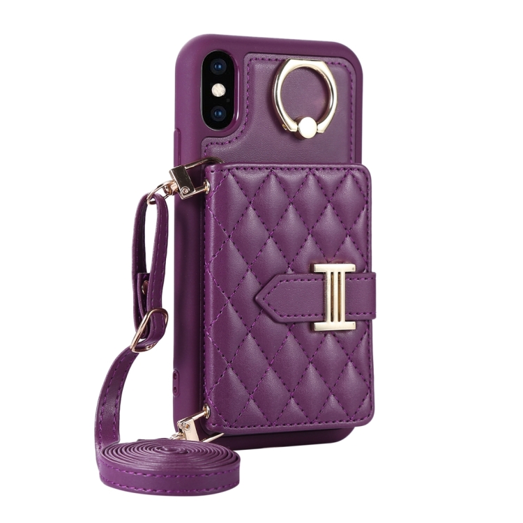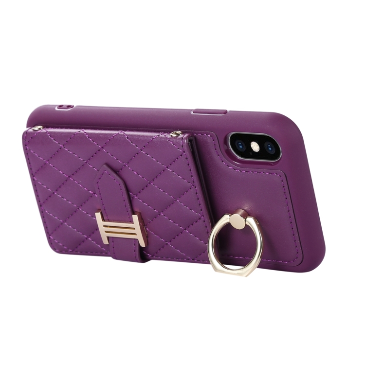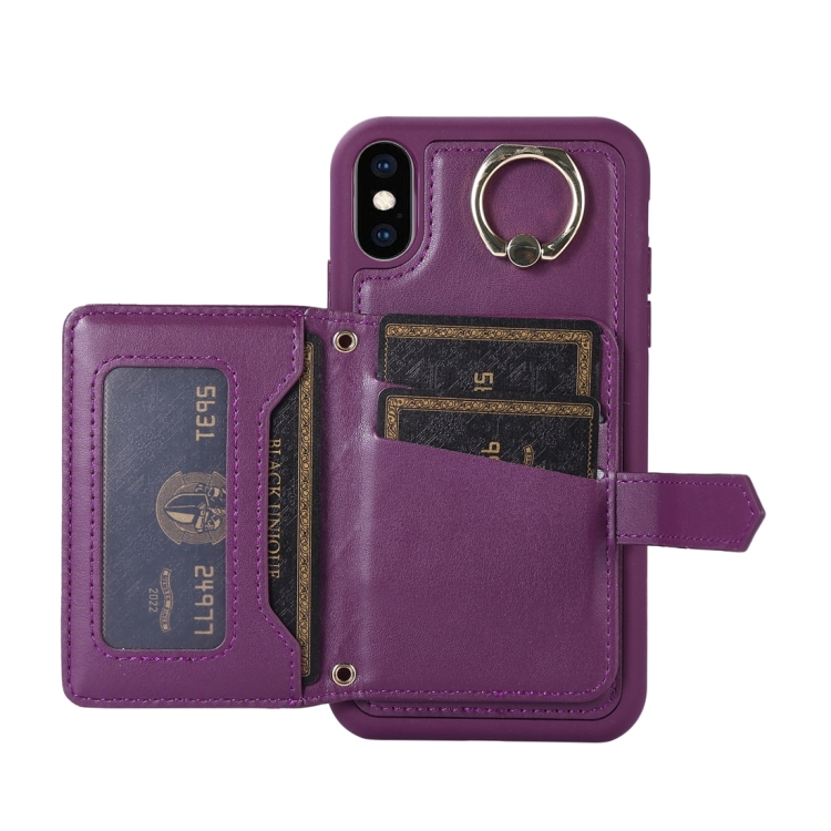 Estuche para Teléfono iPhone X Xs con Soporte de Anillo y Bolsa de Tarjeta Horizontal con Cordón Doble (Púrpura)