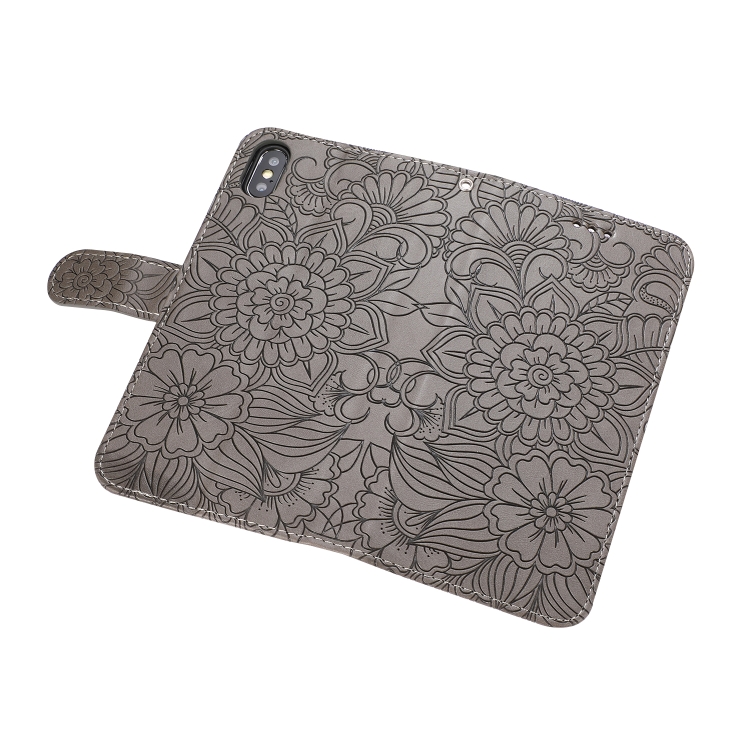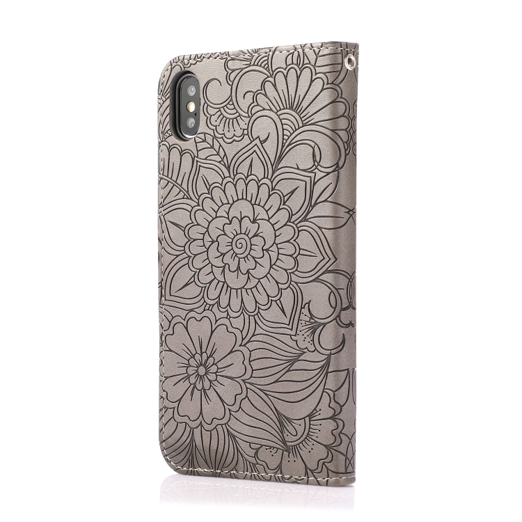 Funda de Cuero para iPhone X Xs con Tapa Horizontal Girasol En Relieve Soporte Ranuras Tarjetas Billetera Cordón (Gris)