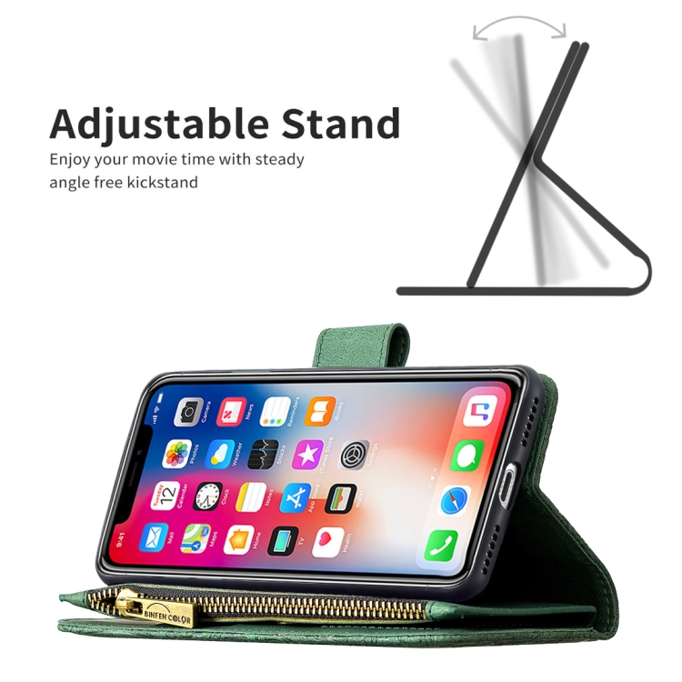 Funda de Cuero para iPhone X Xs con Estampado de Mariposa Voladora, Tapa Horizontal, Cremallera, Soporte y Ranuras para Tarjetas (Verde)