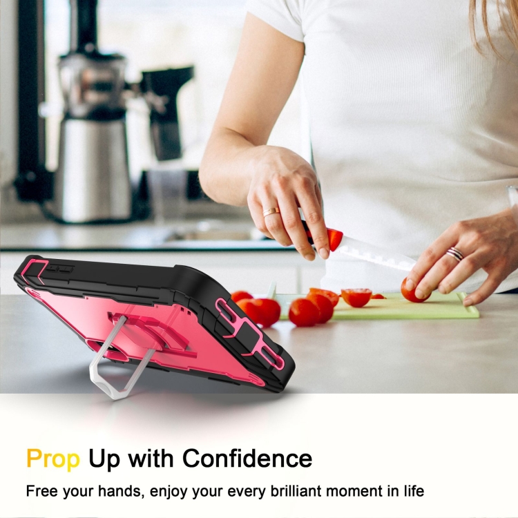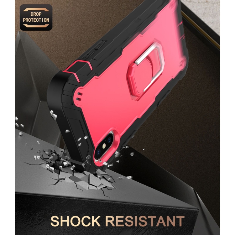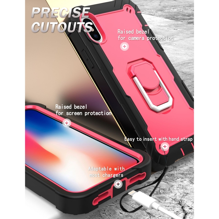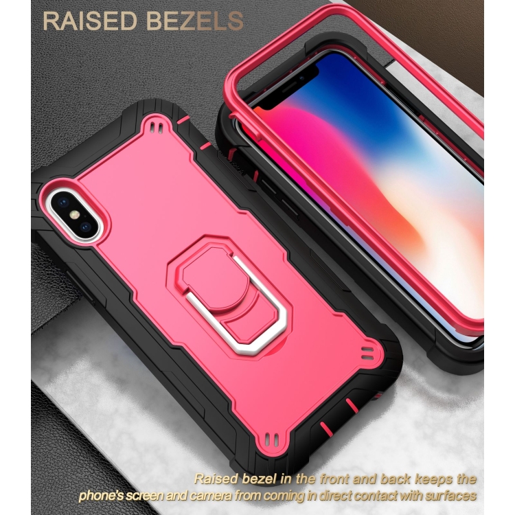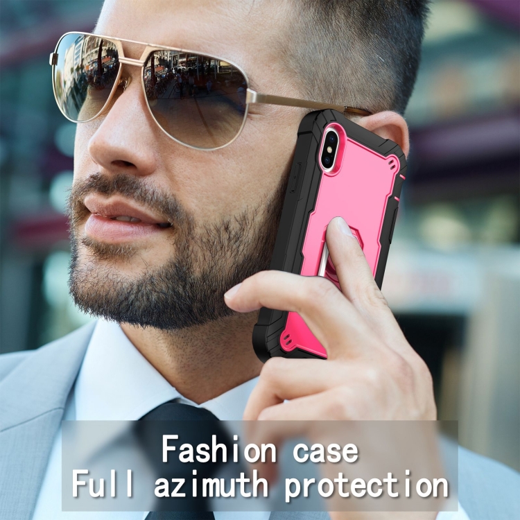 Funda para iPhone X Xs PC con Goma 3 Capas a Prueba de Golpes con Soporte Giratorio (Negro + Rosa Roja)