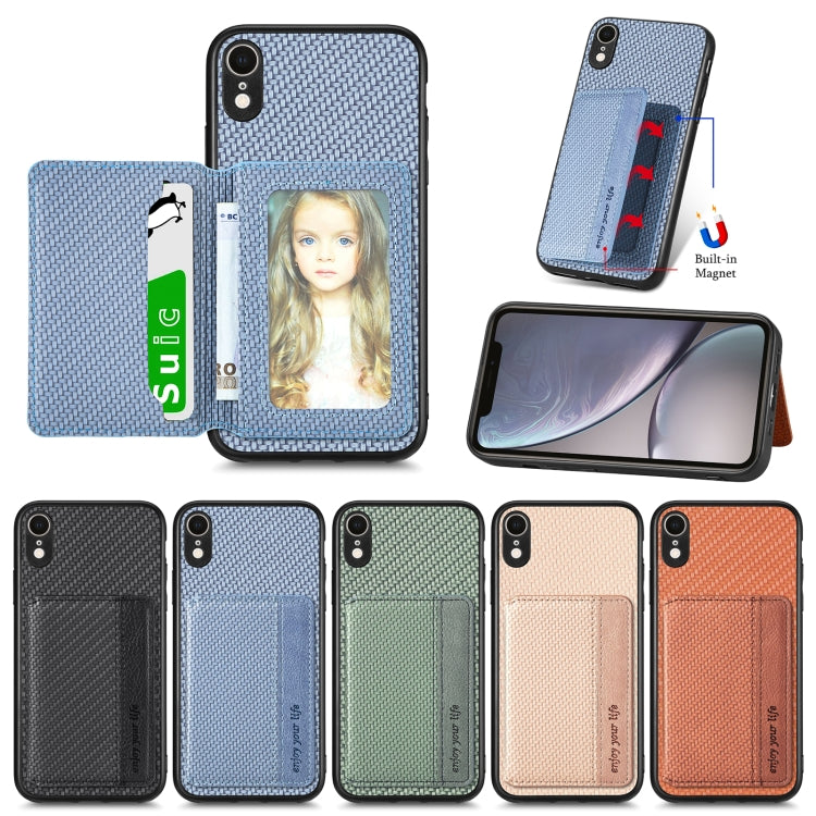 Caja de teléfono para iPhone Xr con bolsa de tarjeta magnética de fibra de carbono (Azul)
