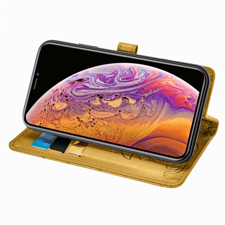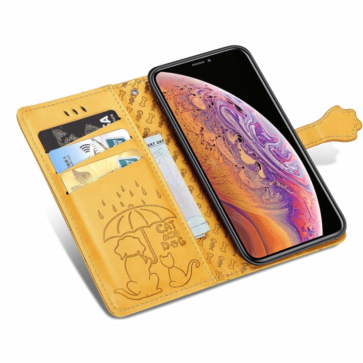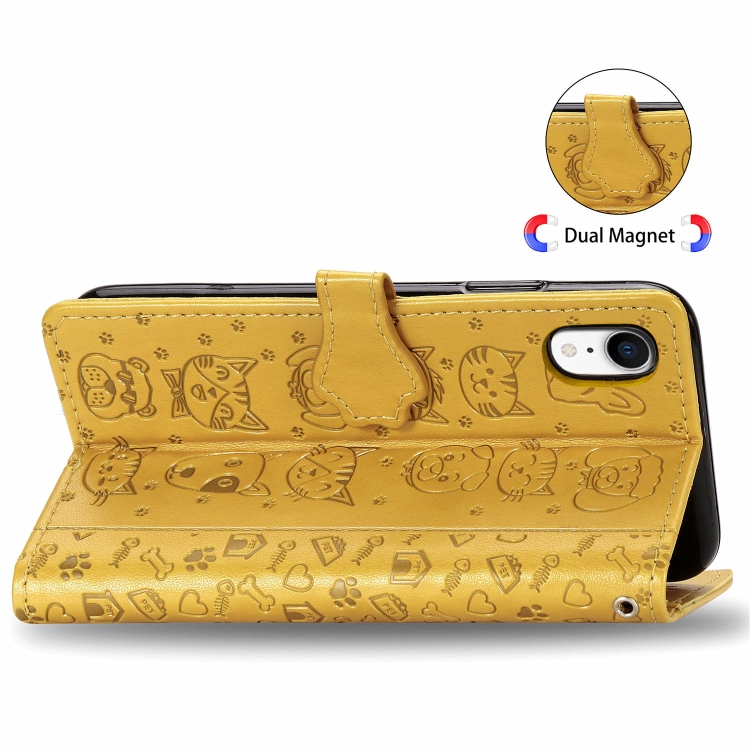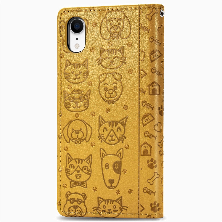 Estuche para iPhone Xr de Cuero PU con Tapa Horizontal En Relieve Gato y Perro Soporte Ranura Tarjeta Billetera Cordón (Amarillo)