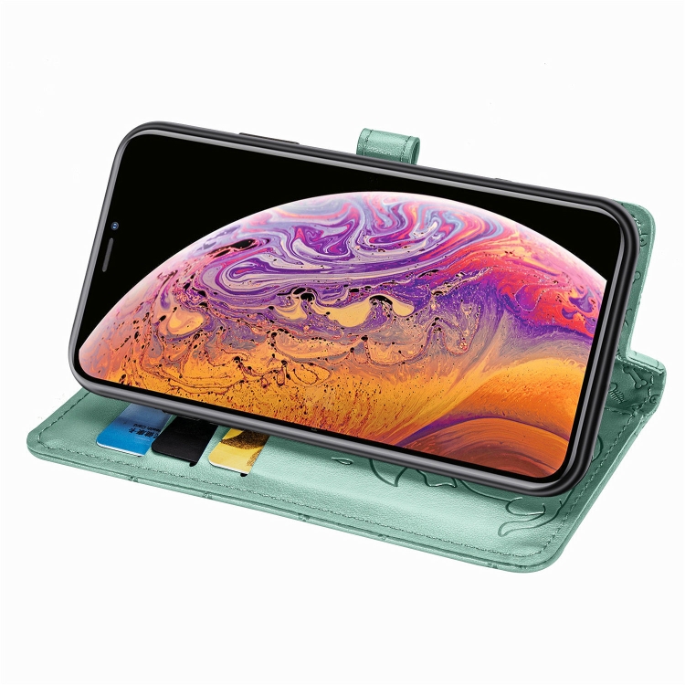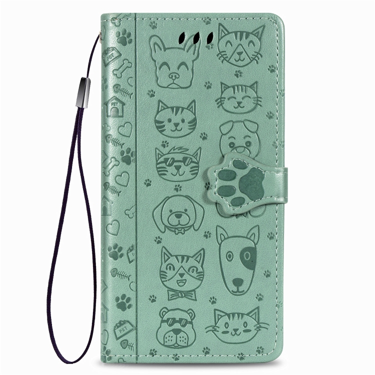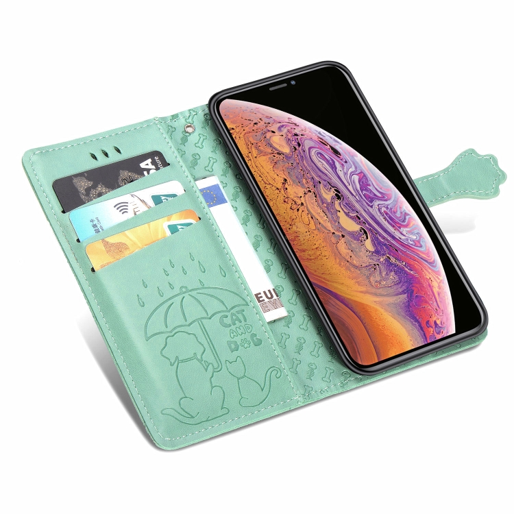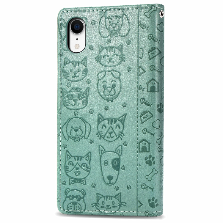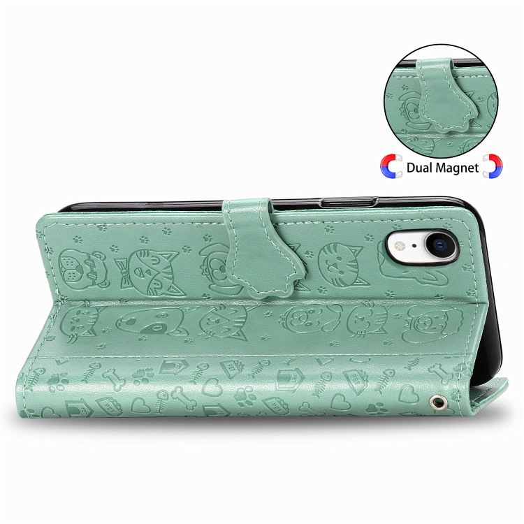 Estuche para iPhone Xr Cuero de PU Tapa Horizontal En Relieve Gato y Perro Soporte Ranura Tarjeta Billetera Cordón (Verde Hierba)