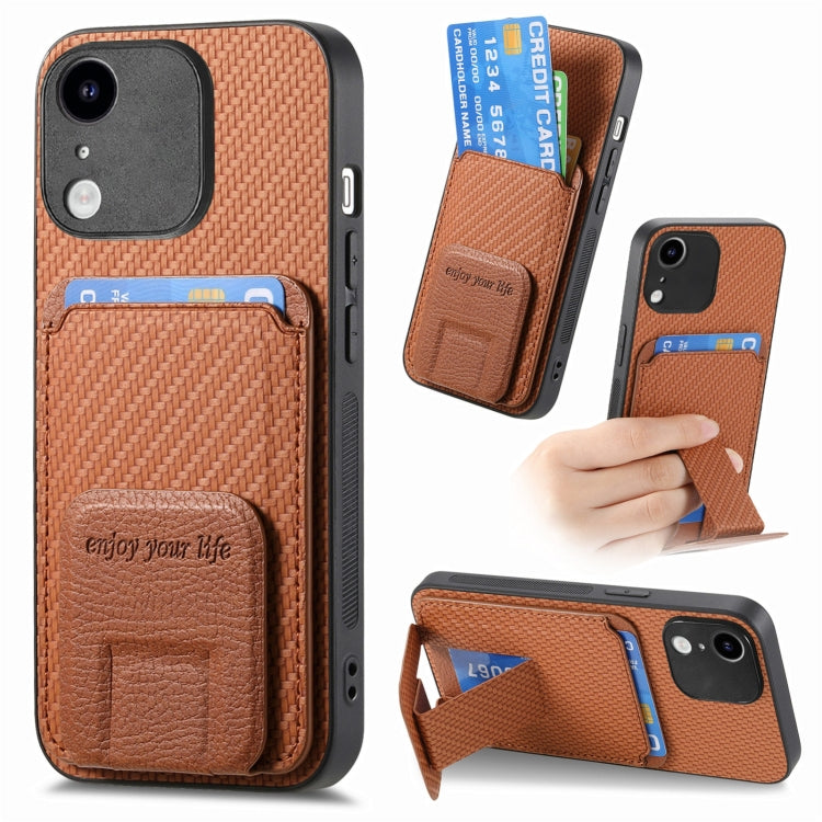 Funda para Teléfono iPhone Xr con Soporte Plegable y Bolsa para Tarjetas Fibra de Carbono (Marrón)