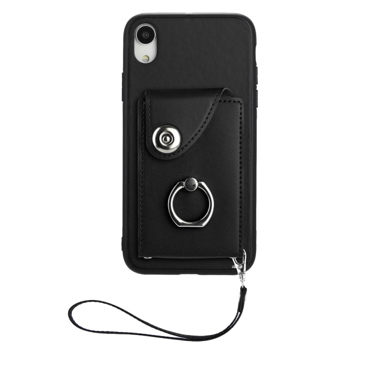 Funda para Teléfono iPhone Xr PU con Soporte para Anillo y Bolsa para Tarjeta con Cordón (Negro)