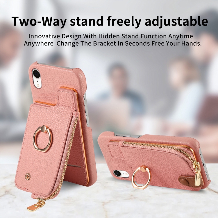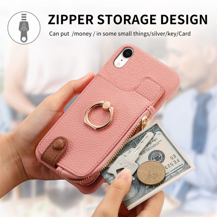 Funda Trasera para iPhone Xr con Billetera, Cremallera y Anillo de Cuero Litchi (Rosa)