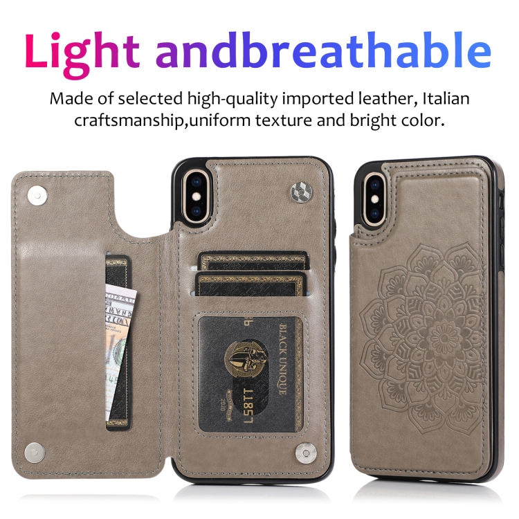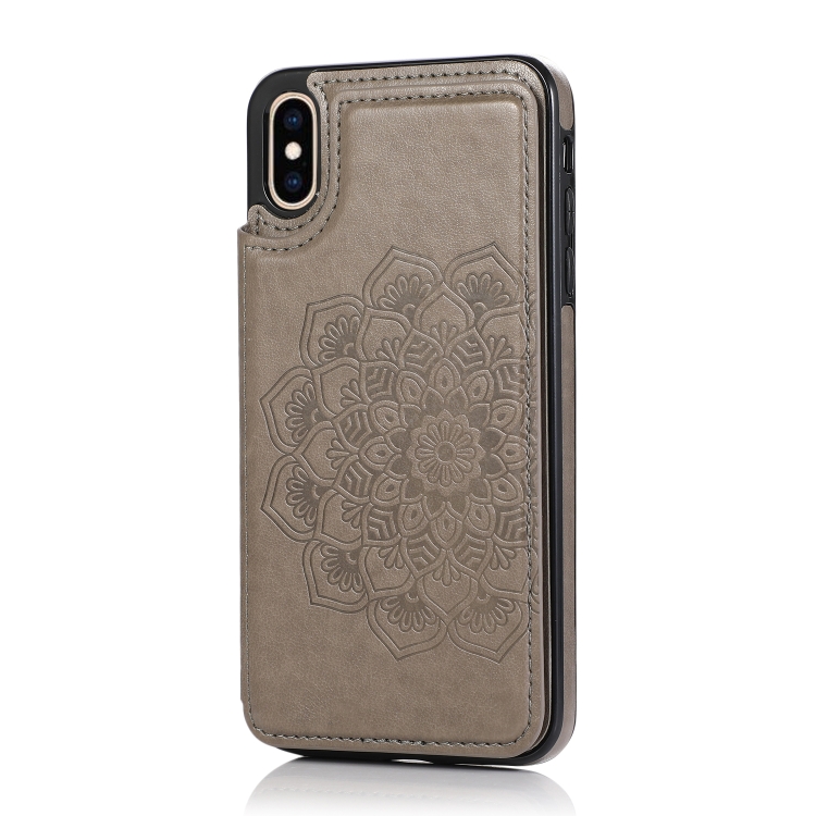 Funda protectora para iPhone Xs Max Doble Hebilla Mandala Patrón PU + TPU con Ranuras para Tarjetas Soporte y Marco de Fotos (Gris)