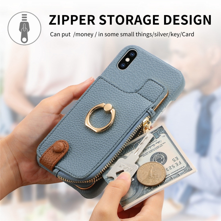 Funda Trasera para iPhone Xs Max con Billetera, Cremallera y Anillo de Cuero Litchi (Azul Claro)