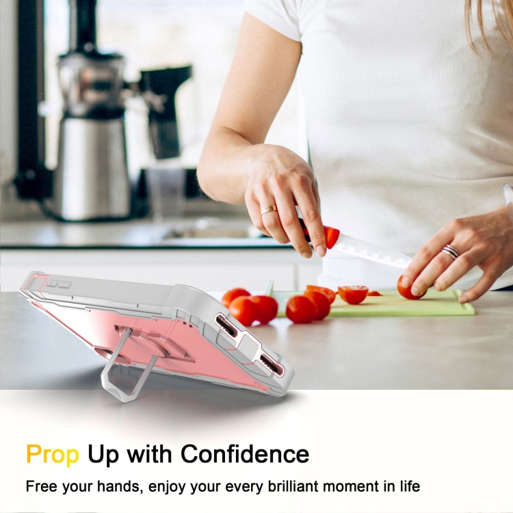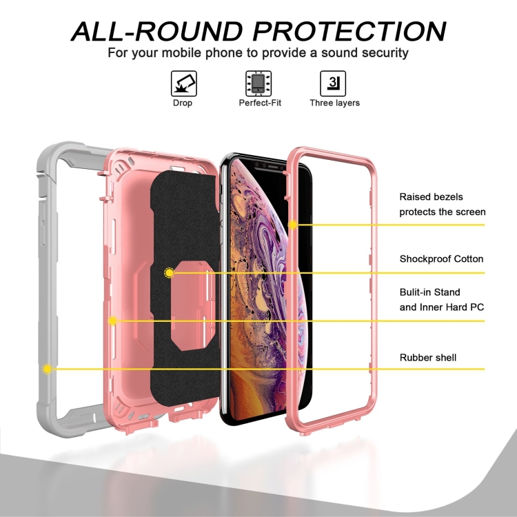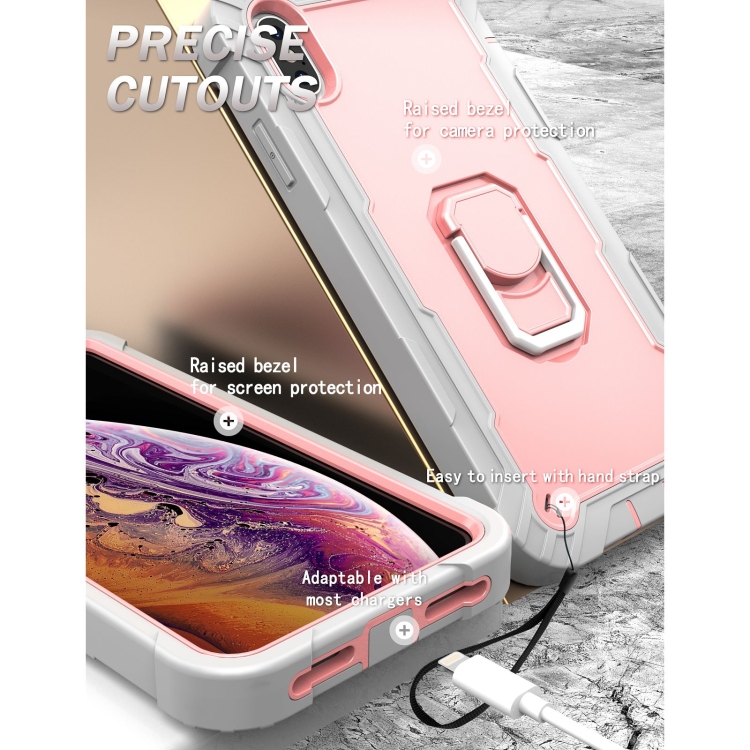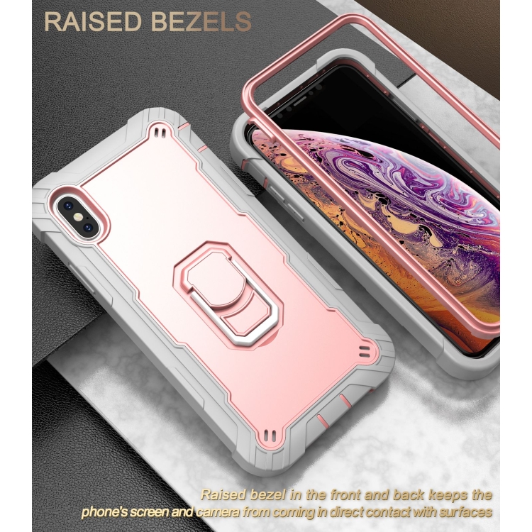 Funda para iPhone Xs Max PC y Goma 3 Capas a Prueba de Golpes con Soporte Giratorio (Gris Blanco + Oro Rosa)
