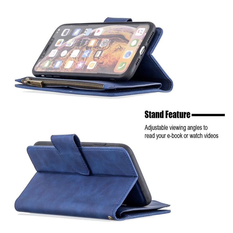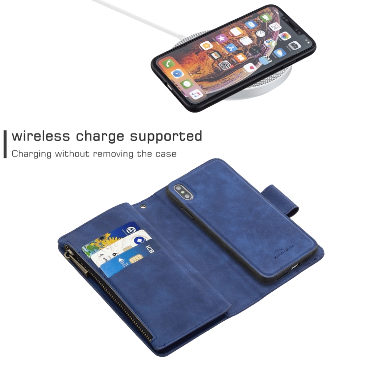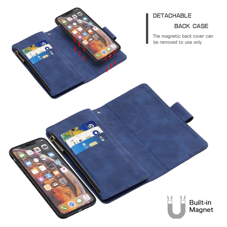 Funda para iPhone Xs Max Skin Feel Desmontable Cremallera Magnética Cuero de Pu Tapa Horizontal Ranuras Tarjetas Soporte Billetera Marco Fotos Cordón (Azul)