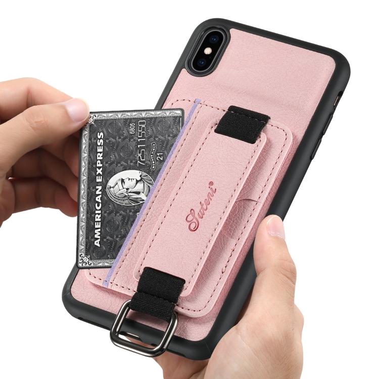 Funda para Teléfono Suteni H13 para iPhone Xs Max con Correa para la Muñeca de Cuero Litchi (Rosa)