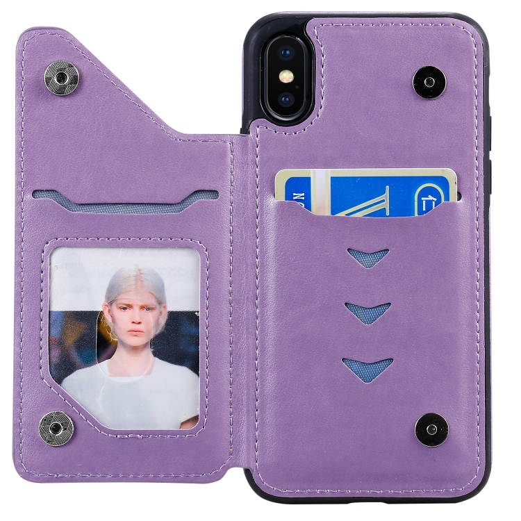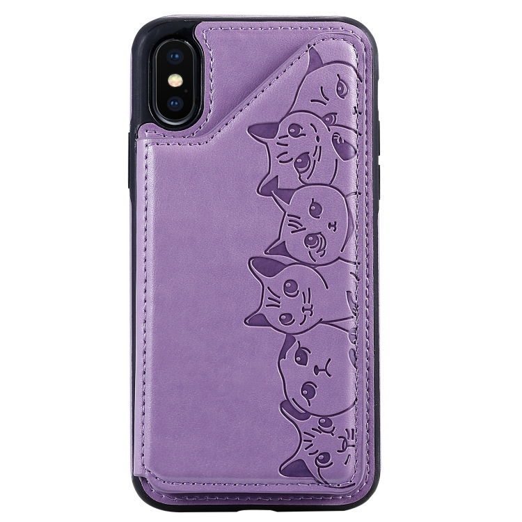 Estuche protector Six Cats para iPhone Xs con patrón de relieve, soporte, ranuras para tarjetas y marco de fotos (Púrpura)