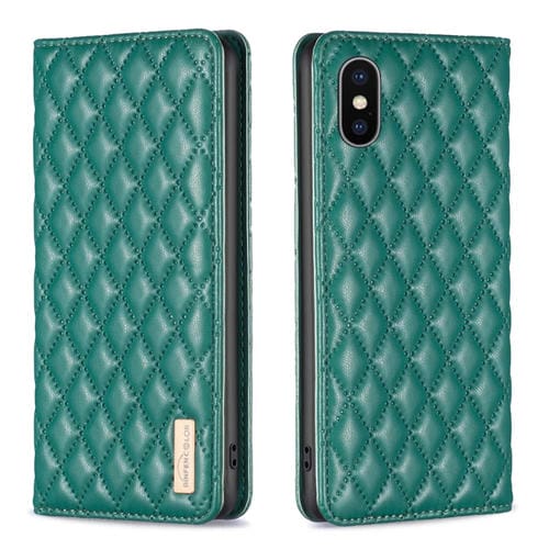 For iPhone XS/X Diamond Lattice Magnetic Leather Flip Phone Case (Green)