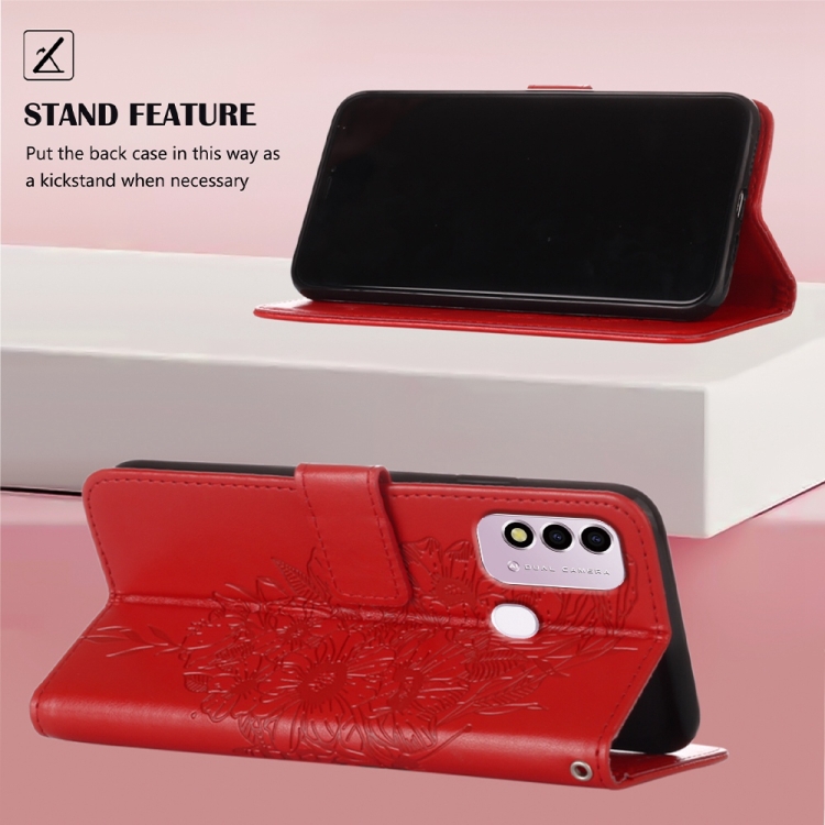 Funda para Itel P37 Vision 2S de Cuero con Mariposa en Relieve (Rojo)