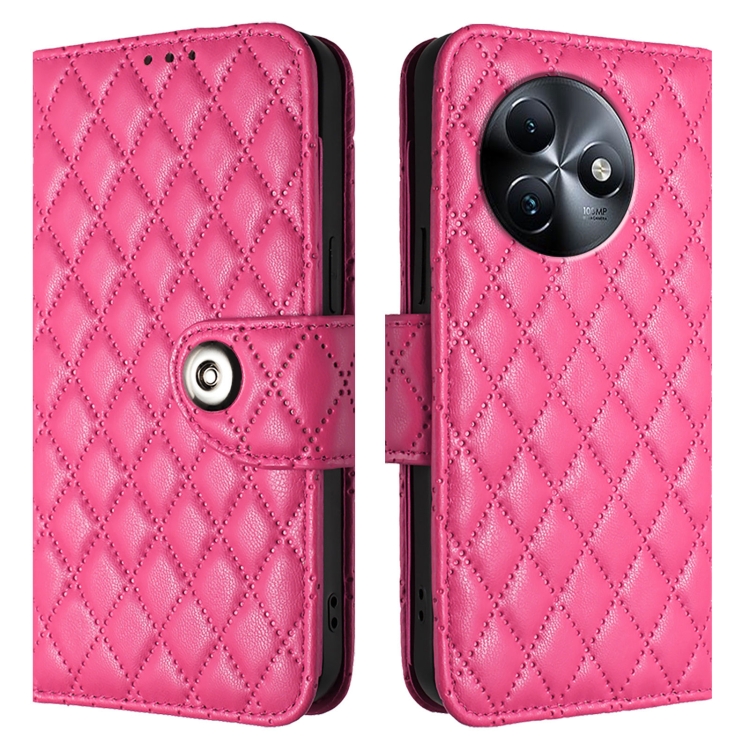 Funda para Teléfono Itel S24 de Cuero con Tapa Textura Rómbica y Cordón (Rojo Rosa)