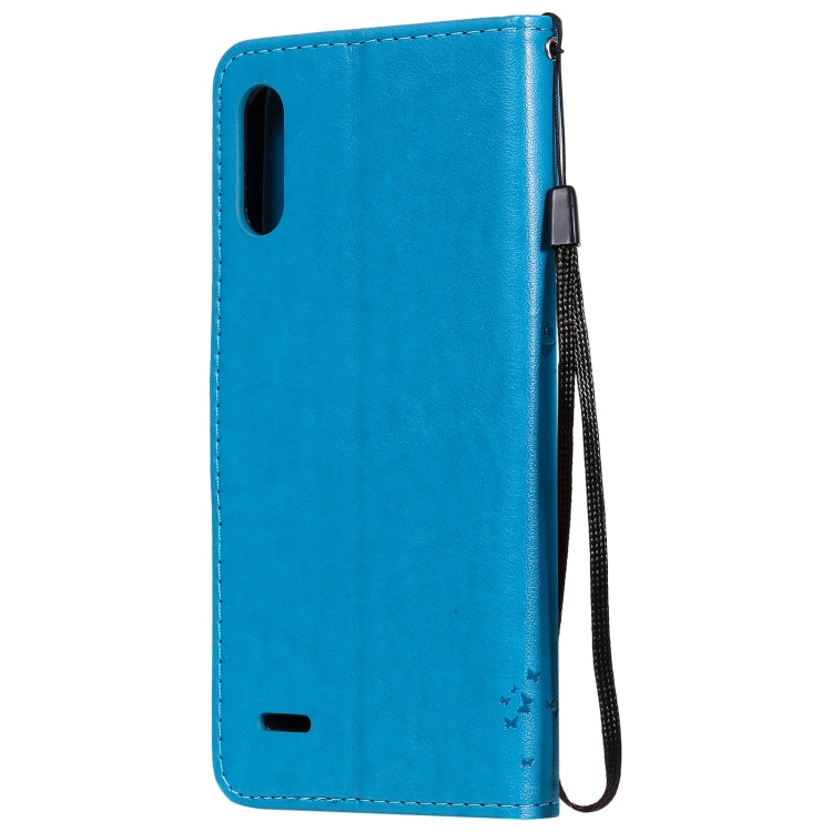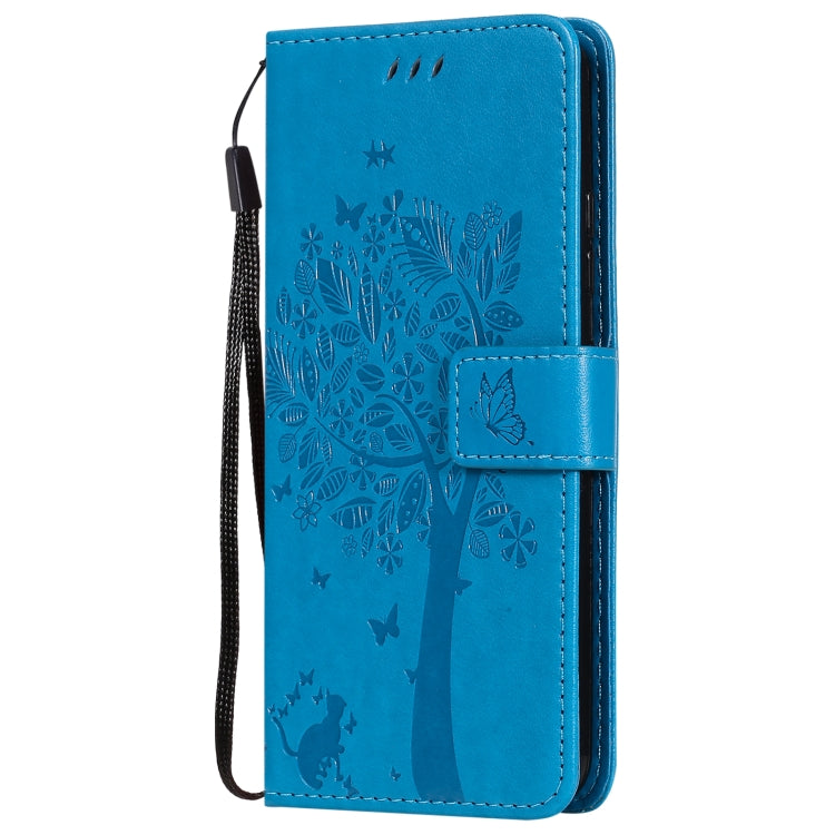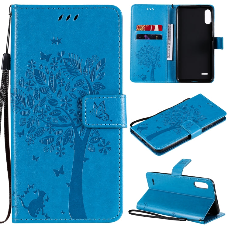 Funda Cuero PU para LG K22 y K22 Plus con Patrón Árbol y Gato, Tapa Horizontal, Soporte, Ranuras y Cordón (Azul)