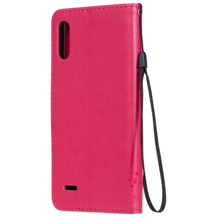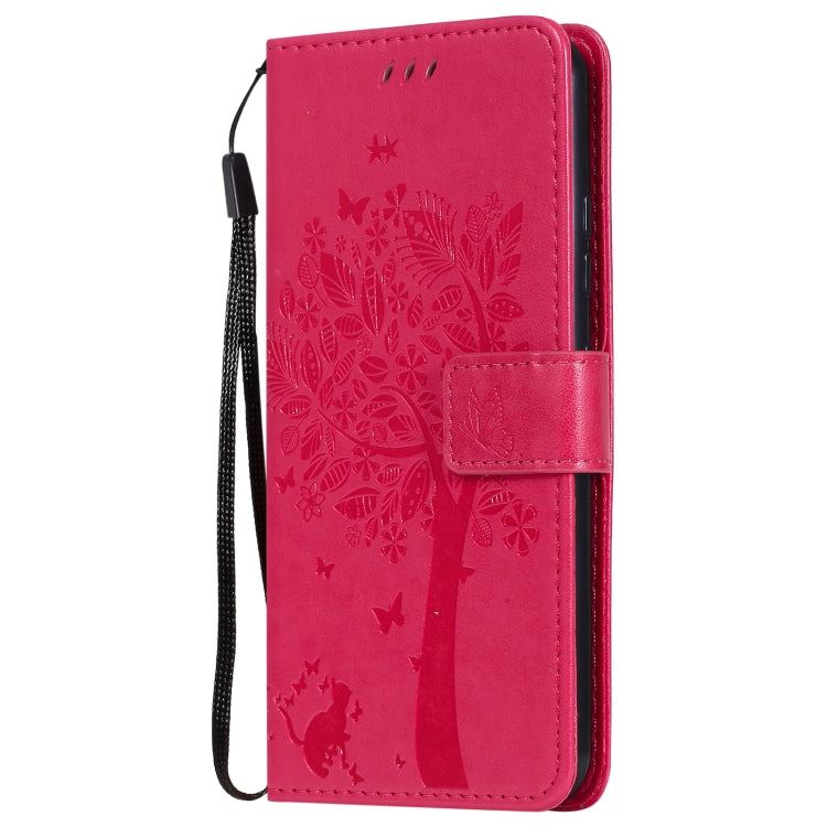 Funda Cuero Pu para LG K22 / K22 Plus con Patrón Árbol y Gato, Tapa Horizontal, Soporte, Ranuras y Cordón (Rosa Roja)