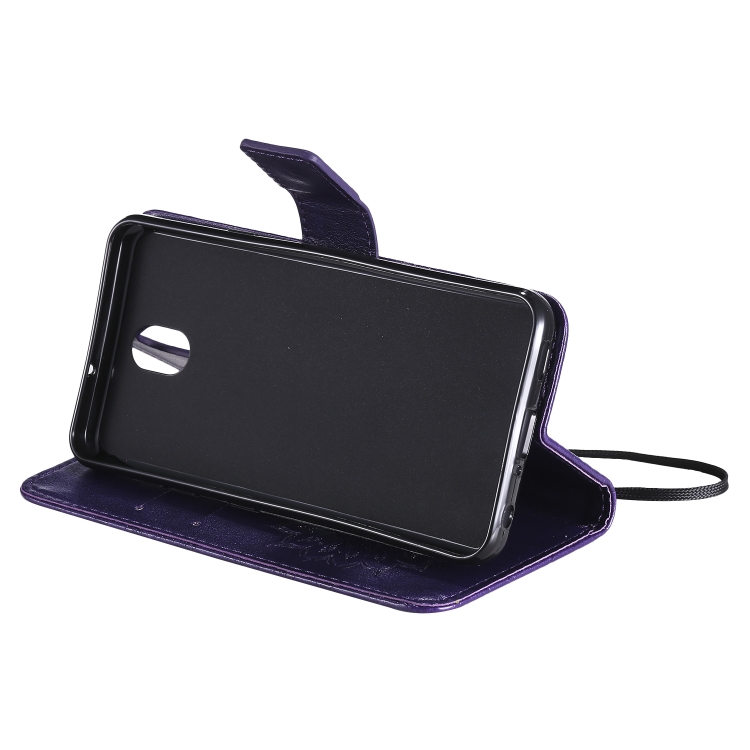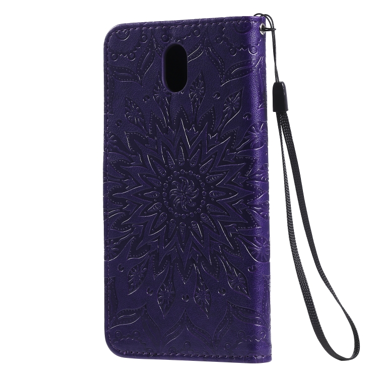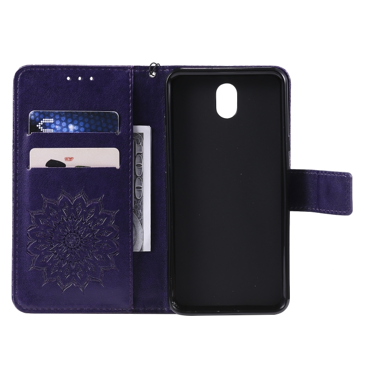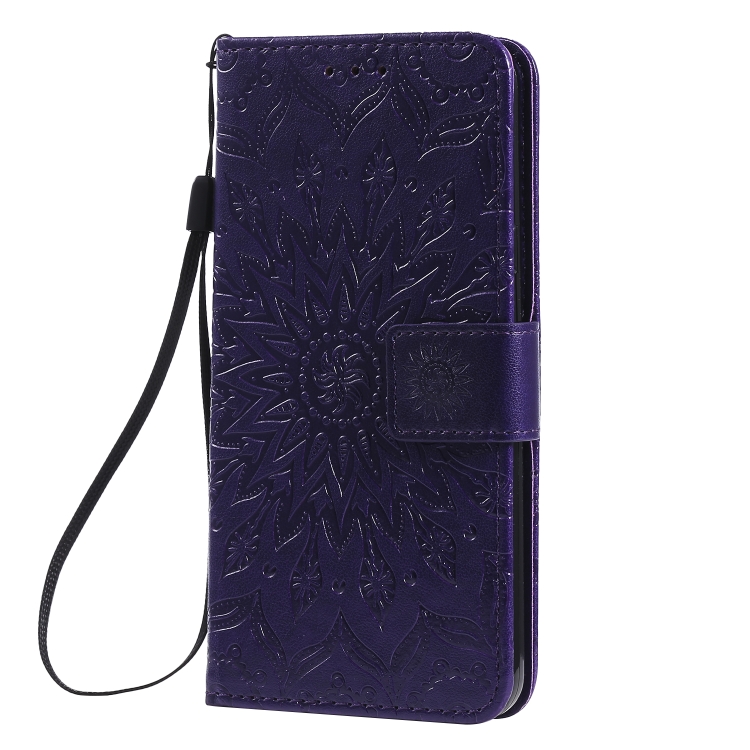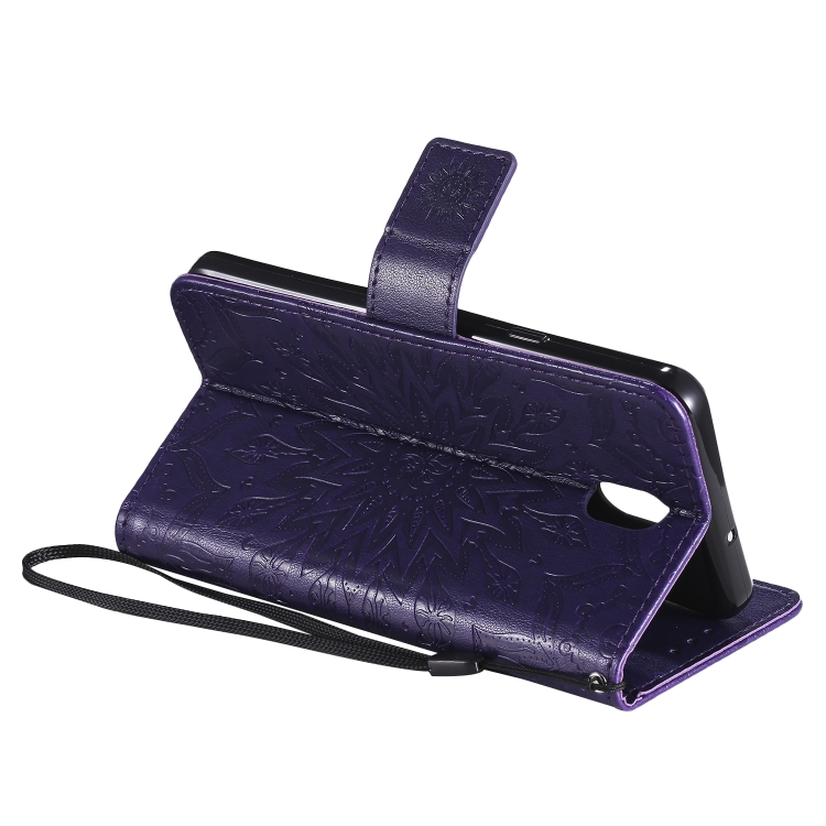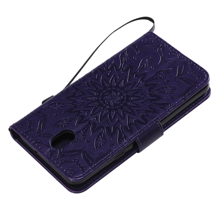 Estuche Cuero Pu para LG K30 (2019) con Tapa Horizontal, Estampado Girasol, Soporte, Ranuras y Cordón (Morado)