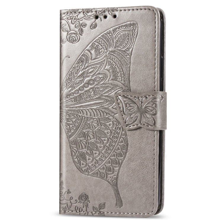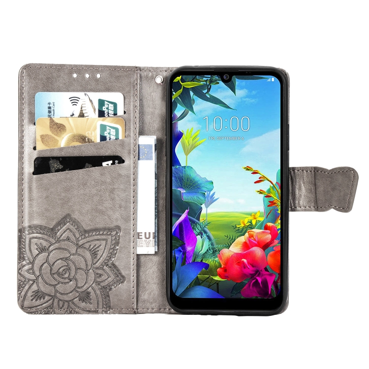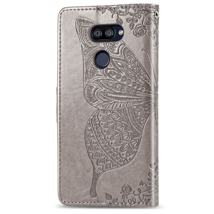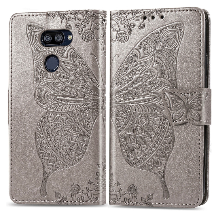 Funda de Cuero LG K40S Butterfly Love Flower con Tapa Horizontal, Soporte, Ranura para Tarjeta y Cordón (Gris)