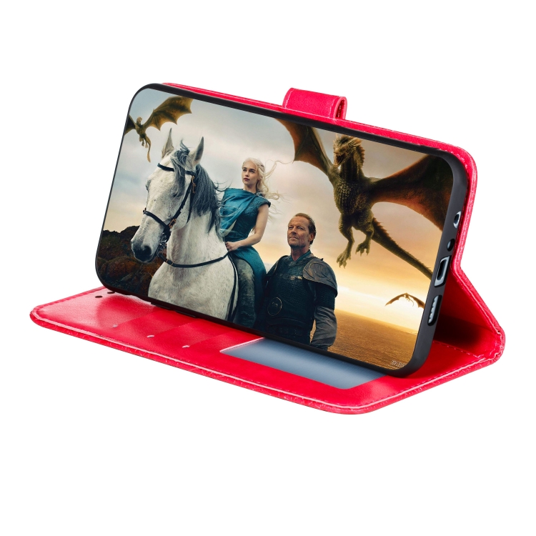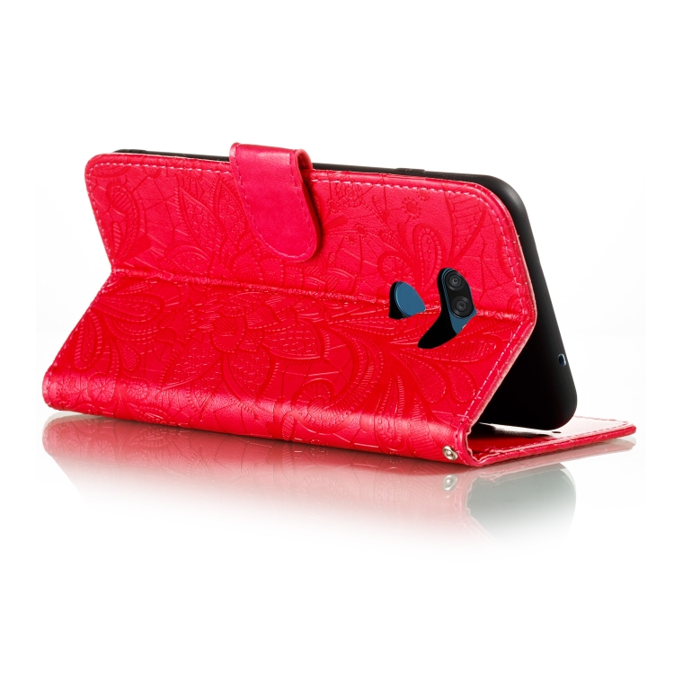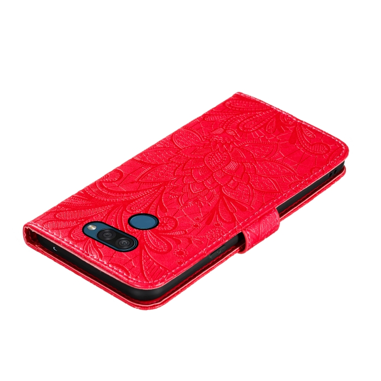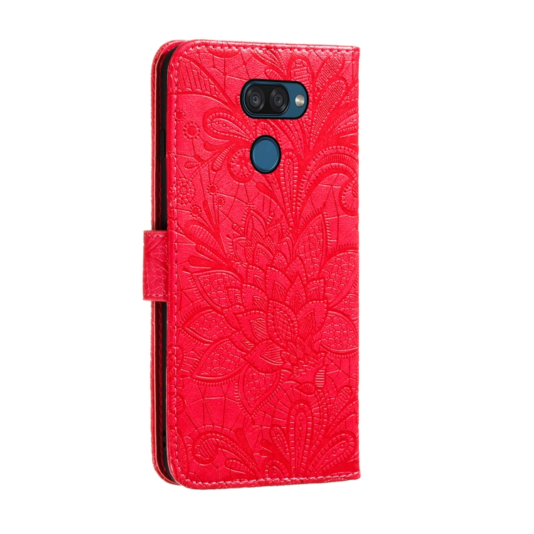 Funda de Cuero para LG K40S con Estampado de Flores, Tapa Horizontal, Soporte, Ranuras para Tarjetas, Billetera, Marco y Cordón (Rojo)