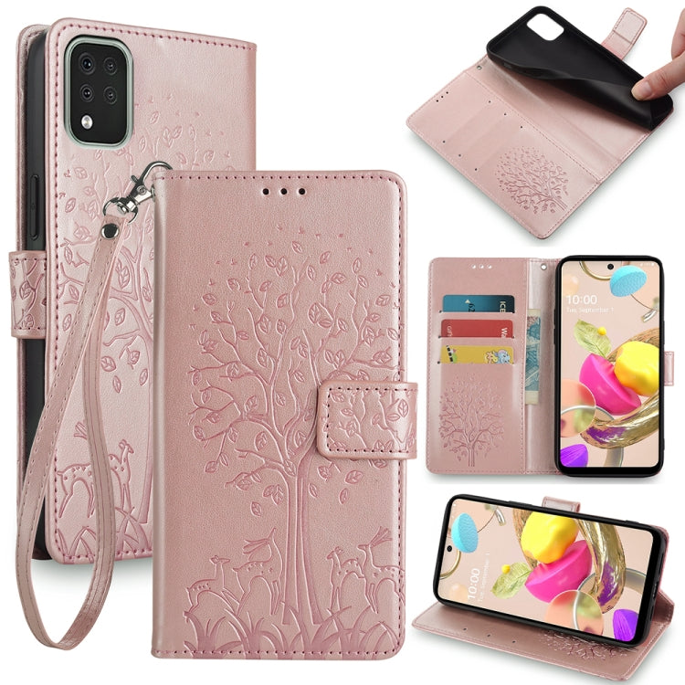 Funda de Cuero para LG K42 con Relieve de Árbol y Ciervo (Oro Rosa)